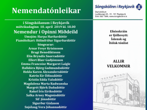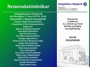 Miðvikudaginn 3. apríl nk. verða nemendatónleikar í Söngskólanum í Reykjavík og hefjast þeir kl. 17:30. Á þessum tónleikum koma fram nemendur Írisar Erlingsdótur og Sigríðar